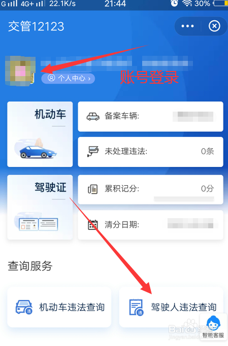 4、在交管12123页面里登录账号,点击下方的驾驶人违法查询。