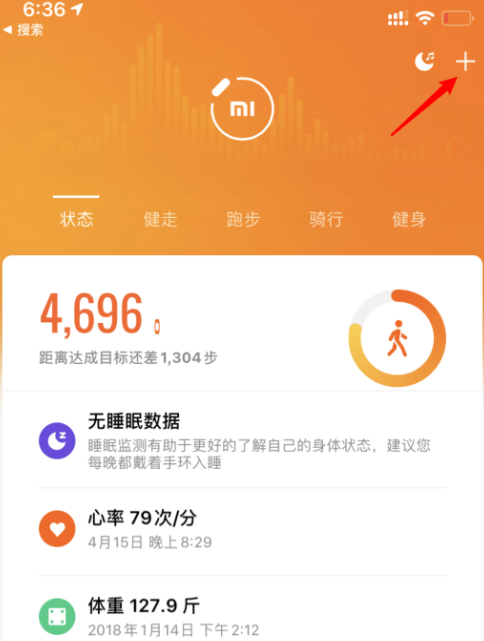 1、打开小米运动应用app,点击右上方的加号图标。