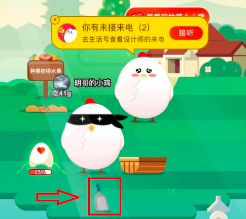 1、进入支付宝蚂蚁庄园,然后在首页点击红色区域锄头工具;