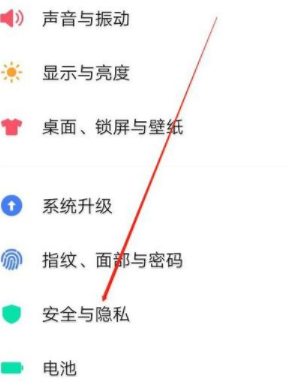 1、首先对于手机的设置功能进行打开,然后找到其中的安全与隐私功能。