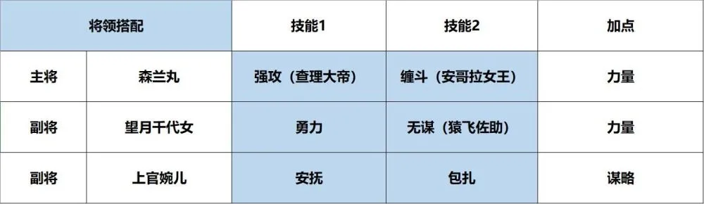 3、技能搭配:森兰丸和望月千代女负责输出,由于其自带技能均为追击型,且发动概率较低,所以应当考虑搭配其他类型的输出技能,避免被敌方【缴械】效果所克制。上官婉儿的自带技能仅提供前四回合的治疗效果,所以可以搭配其他治疗技能,或是解除己方将领负面效果的技能。