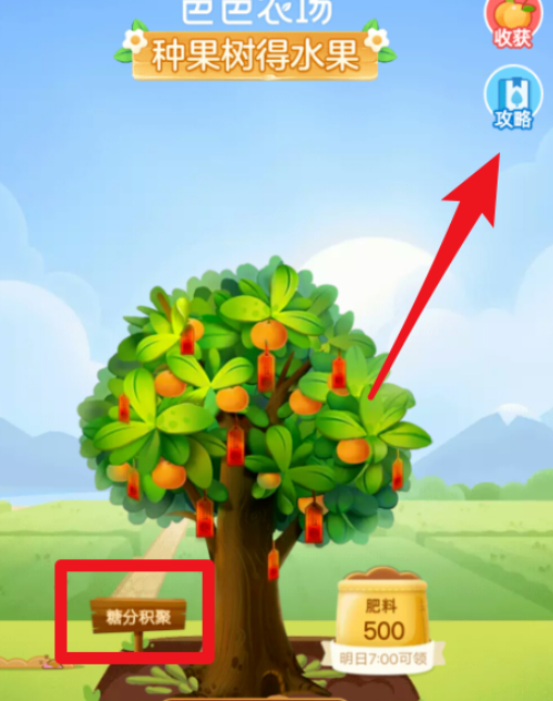 4、进入到【芭芭农场】页面后,我们点击右上角处的【攻略】选项