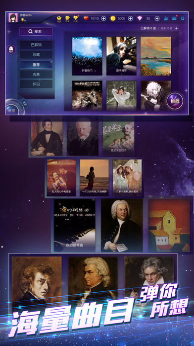 海量曲目,每日更新,流行、经典任你弹奏。 收录海量的钢琴曲目,周杰伦、薛之谦、毛不易、肖邦、理查德,热门流行,古典经曲,一网打尽!每日更新,紧追当下的流行步伐。