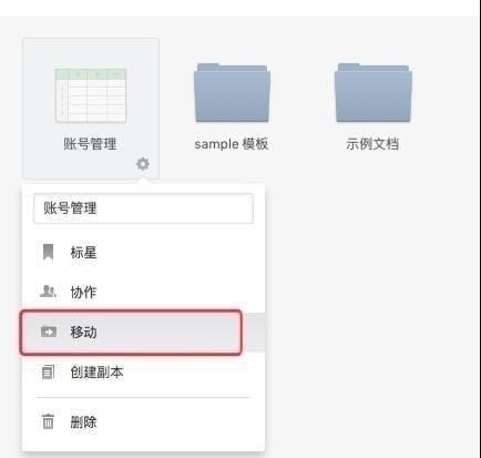 将鼠标放置在要移动的文档/表格,点击右下角的「 齿轮设置 」按钮,选择「 移动 」:
