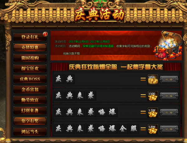 兑换奖励:l集齐庆典兑换58w绑金l集齐庆典来袭兑换1500元宝l集齐庆典来袭嗨爆兑换15000元宝l集齐庆典来袭嗨爆全场兑换58000元宝活动界面: