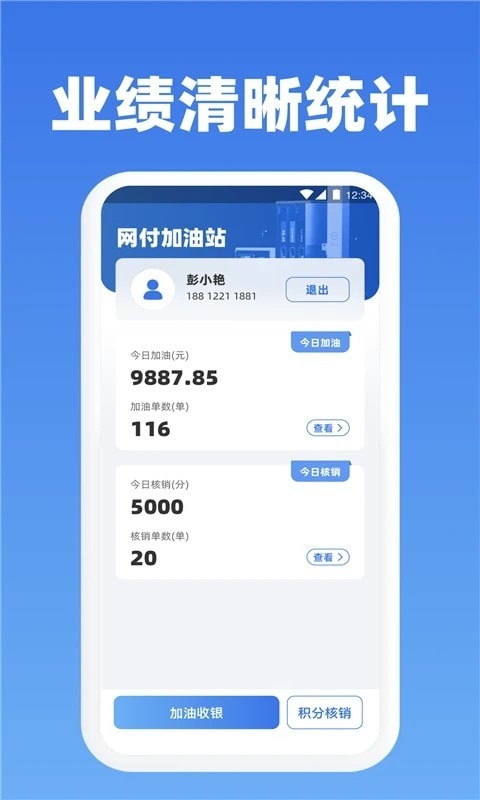 网付油站app,油站经营者必备的移动办公平台,支持加油收款、业绩统计分析、积分核销、会员管理等多种功能,随时查看加油订单,提高工作效率。